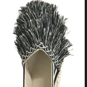 Comfy and stylish espadrilles. Black & white stripes. Fringe in the front.