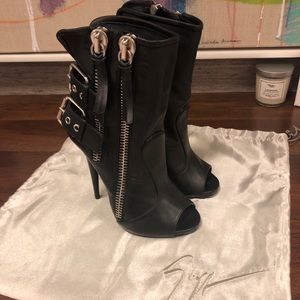 Giuseppe Zanotti Double-Buckle Biker Peep Toe Bootie in black. New with tags (no box). 5" covered heel, exposed double zipper at outer side. Perfect condition, NEW! Fits true to size.