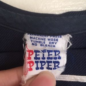 Vintage Peter Piper Vintage Sailor Top. Patch on the Left Sleeve. Permanent Marker Scribble on the Lower Front. Neckerchief is Missing. Adorable Anchor Buttons on the Wrist. Unisex.