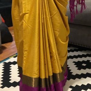 A yellow half silk saree with purple and bronze tone border. Has a small stain from sewing machine oil. Some signs of creasing from folding. Blouse not included. Can be worn with a crop top. Used only once. Can be worn casually or to a formal event. Wear it to a holud, mehndi, mayun, wedding or a party. Can be glamorous with a golden blouse and some jewelry.