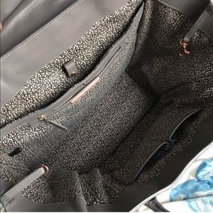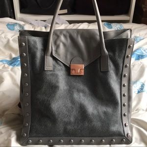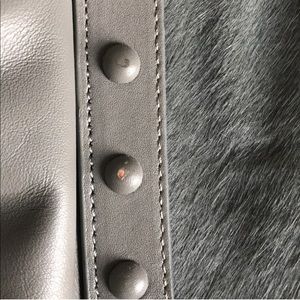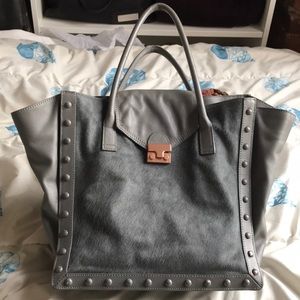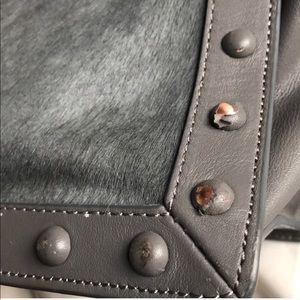 Such a beautiful bag. All the flaws are pictured. Only the studs. You might be able to get that fixed. There is no discoloration. It's a classic gray. This bag can fit a ton! Has not been used much! All offers welcome!