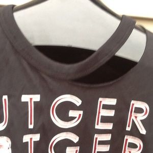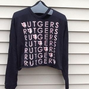 Rutgers SHIRT, BIG LOGOS IN THE FRONT WITH REd ACCENTS AND PINK LOGO IN THE BOTTOM AND NICE AND FUN DETAIL IN THE NECKLINE. CROPPED LENGTH. THIS SHIRT LOOKS AWESOME!