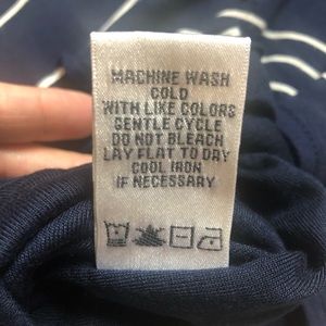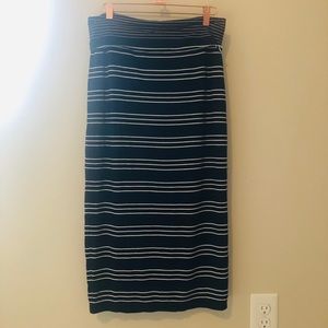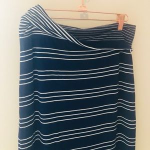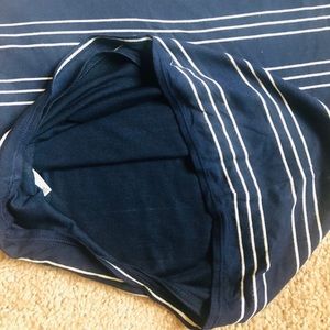 NWT. Navy blue with white striped skirt. Has a fold over elasticized waist band. Slip on styling. Approximate measurements laying flat: 31” L (with band being folded) 14.5” waist. Fully lined. This would be a great skirt if your pregnant (reason I bought) but works if your not too. Stretchy (soft jersey fabric feel to it) Super comfy