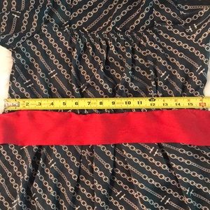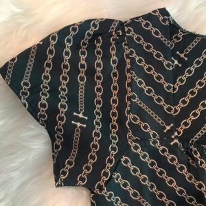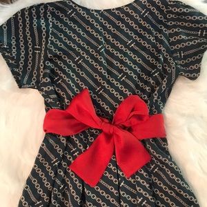 Purchased in the UK, this Polyester satin dress is light and flowy. A beautiful 3” wide sash tie compliments the hunter green dress. Cream colored all over linked chain pattern. Squared neck with elastic edge of front neckline that creates a soft gathering of fabric. Measurements; Armpit to Armpit 16”. Length from shoulder to hem 32”. Cut the size label out as it was scratchy. It is a small. In excellent condition. Only worn a few times.