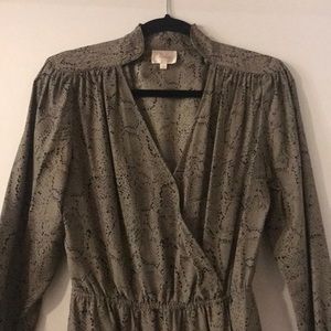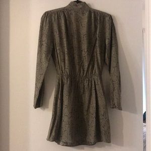 Parker silk, army green and black python print long sleeve mini dress. Quilted stitching on shoulders and button snap front closure detail. Cute with heels or boots!