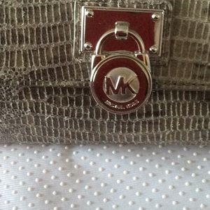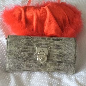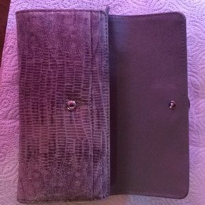 Patent leather , looks like snakeskin , .Pre owned in good condition . Holds lots of credit cards , roomy inside .Distressed look and feel on outside , it came this way when I purchased it years ago