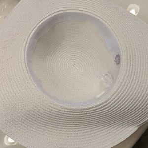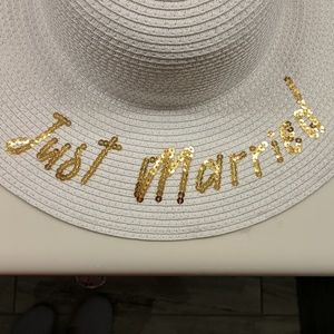 White wide brim sun hat with Just Married written in gold sequins. Great condition with minimal makeup on the inside. Ready to go to the beach with you on your honeymoon!!!