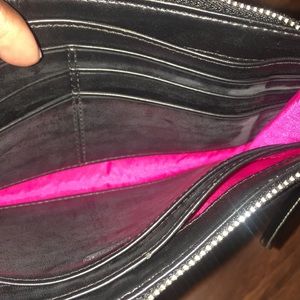 Wristlet is in over all excellent condition. It does have a little nick of wear as shown in picture where leather rubbed due to zipper. Wristlet has a front pocket for your cellphone and 6 slip pockets for your cards. It has 3 larger slip pockets for your cash or other important items. It’s perfect carrying when shopping or when a bigger purse is not wanted. CB