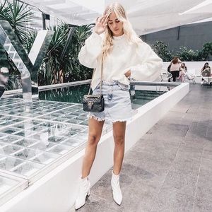 This gorgeous white knit sweater is loose fitting with drop shoulder lantern style sleeves and a round neckline. Material is 100% acrylic, super soft and lightweight. Style this sweater tucked in with a cute skirt, knee high boots, and sleeves worn either rolled up or not.