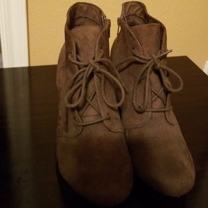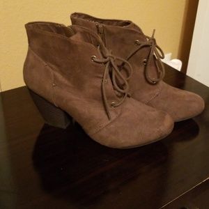 Dark brown boots with a zipper on the side. Brown Shoelace. Great condition