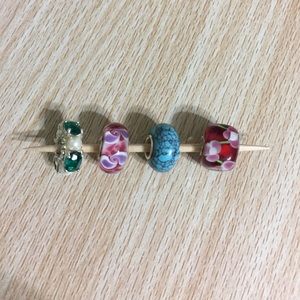 Four beautiful European Charm Beads, three glass and one gemstone. My coworker gave me a bracelet, but it’s just not my style.