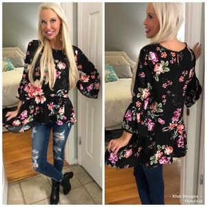 Oversized Shark Bite Hem Floral Black Tunic with 3 qtr Bell Sleeves and Collar Detail!