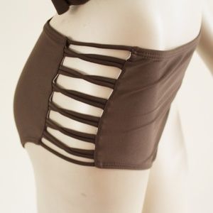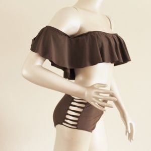 Flounce top has raw edge ruffle. 15 inches across bust unstretched. Arms can be worn on or off shoulders. High waist strappy bottoms are fully lined. Unstretched they measure 14 inches across waist, 15 inches across hips and have about 11 inch rise. They seem to run a bit small, not a lot but a little, maybe a size, so please check the measurements to a swimsuit you already own.