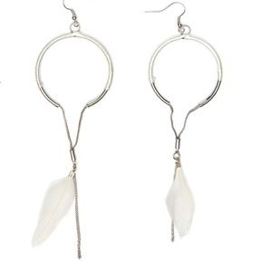 Modern dangle fishhook ivory feather earrings. Thread wrapped hoop with chain feather dangle. Color and shape of feathers may vary slightly. Silver tone. Approximate dangle length 6"