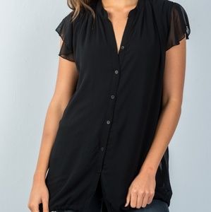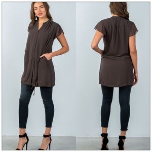 Unique but basic long tunic top in a goes-with-everything shade of sepia gray, by Miilla. Buttons down the front, but can just be pulled over the head. Drawstring hem. Chiffon flutter sleeves. Mandarin V collar. Full lining. And two front pockets! Relaxed fit, so may want to size down one.