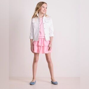 Adorable children’s jean jacket in white. Two snap pockets at front. Two pockets at front for hands. Two pockets at inside of jacket.