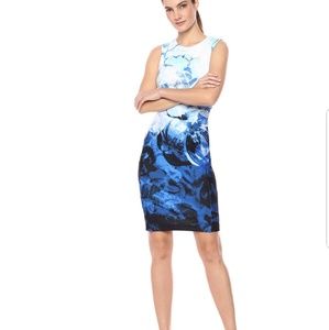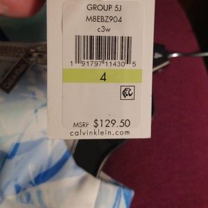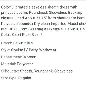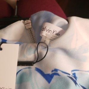 NWT Blue and white Calvin Klein dress size 4. Back silver zipper, fully lined. Shell is 95% polyester 5% spandex. Lining g is 100% polyester. Awesome dress for either the office, or happy hour!