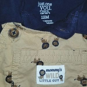 NEW w/o tags: Just One You, made by "Carter's". SOFT Navy Button Collared Onesie w/snaps at crotch & Tan Overalls also snap in crotch & have cute Lions & says "Mommy's Wild Little Guy"; Size 12 mon.