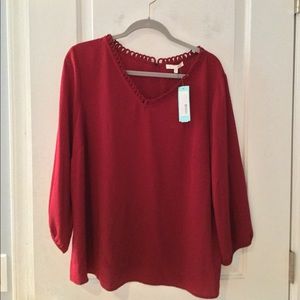 Burgundy Long Sleeve Blouse Scallop Trim