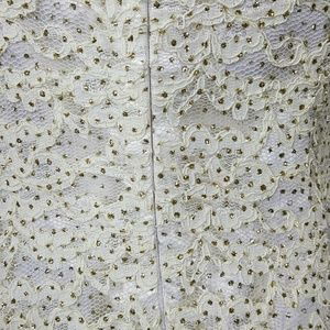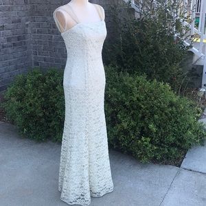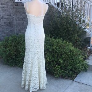 Size 7/8. Ivory, lace dress embellished with tiny gold dots, gold tulle straps. Back zipper for closure and support. The bust measures 30", waist is 26", hips are 32", and shoulder to hem is 58". Made in the USA. 100% polyester and the lining is 100% acetate. Spot clean only. Style# 2904. Cut# 7. Flori Designs.
