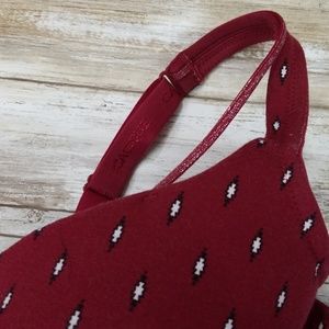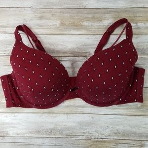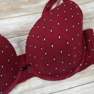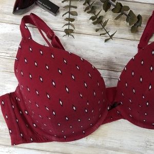Brand new, never worn! Padded, pushup, underwire, plunge bra from Lane Bryant. Made primarily of cotton, its comfortable and breathable. Features a cute black & white Aztec print against a burgundy background, 4 hook closure, and a cute sparkly burgundy & silver strap to give the caged look. Comfortable and stylish!