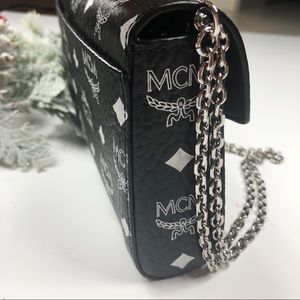 MCM Millie in black w white logo all over. Limited edition. Can be worn as a clutch, crossbody or shoulder bag. Straps are detachable or wrapped around to create a shorter strap as shown in photos. One zipper pouch. Slide pocket. Laurel lock closure. Brand new. Comes with dust bag and care card.