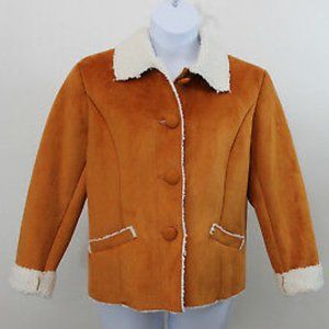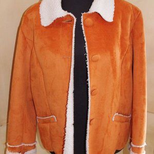 CHICO'S Orange Faux Suede Sherpa Jacket HIMALAYA. Sherpa faux fur lining. Sherpa fur trim. CHICO'S Orange Faux Suede Sherpa Jacket.