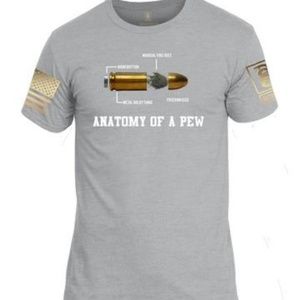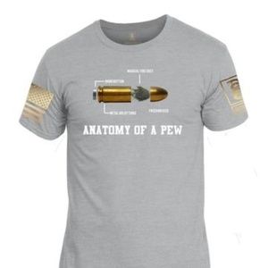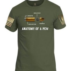 Anatomy of a PewT-Shirt Men's Cotton T-Shirt, American Flag on one sleeve and our logo on the other sleeve.