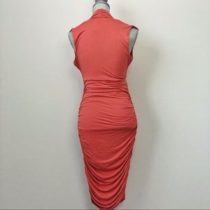 Coral ruched column dress with v-neck. Form fitting. Never worn. New with tag.