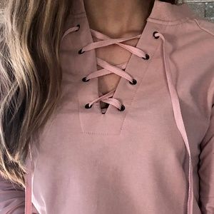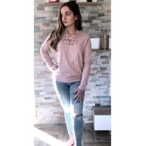 Lace up front detail terry cottonsweatshirt| Blush