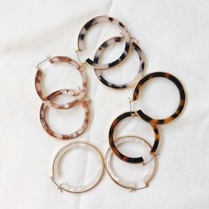 • Boutique item • Acrylic hoops get an updated look with gold rim metal wrap around. Chic and modern, a great staple to add to your wardrobe. 1 3/4" diameter. Color is a creamy white pink/black.