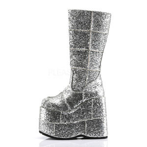 7" Platform Knee High Glitter Boots. Patching Details on Platform and Vamp. Full Inner Side Zipper Closure.