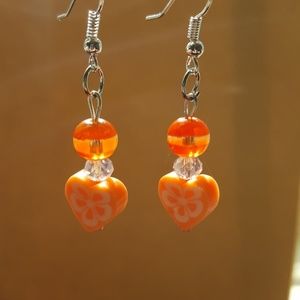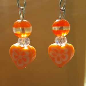 Orange color scheme ... Orange striped bead, Clear Crystal and a Orange heart with white flower, hook wire back silver plated