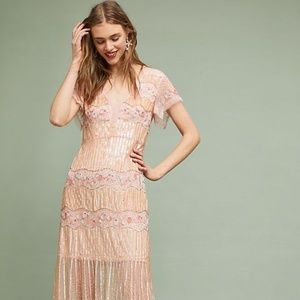 An intricately beaded, turn-of-the-century-inspired silhouette in feminine hues. Color IRL is a bit more pink and less peach. Fully embellished. This dress was purchased in brand new condition with tags and never worn, however due to the intricate nature of the garment, I cannot guarantee there won't be some loose or missing beads/sequins. Comes w/ extra beads/sequins. Retail $798 + tax.