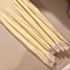 Beautiful bright yellow, with beautiful lace on the bottom,waist laying flat across the natural line of dress is 20 inches, new with out tags. Adjustable spaghetti straps. Cotton/ rayon