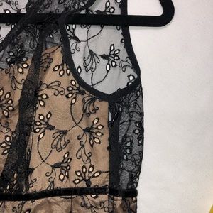 Pre-Owned Woman's A.B.S. Evening by Allen Schwartz | Black V-Neck bustier floral design lace dress with a color Tan Lining Sz M