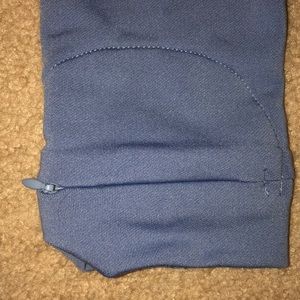 Super comfortable, half-zip athletic top. The color is grayish blue and has a small zipper/pocket feature on the left sleeve of arm (see photos). Great, used condition!