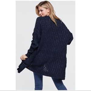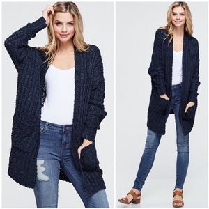 A long sleeve thigh length solid knit popcorn textured cardigan featuring side pockets. Fabric is soft and drapes well.