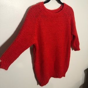 Cozy red thick cable knit sweater. There isn’t a size in it, but is 23” from pit to pit and 24” from bottom of neckline to bottom of sweater.