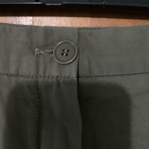 Lacoste Womens Pleated Green Khaki Shorts Size 12 New. Brand new without price tags and with a minor defect. There is a very minor darker spot on right front leg. Belt loops do have holes in the middle which were put there by the manufacturer. May be some other minor wear spots from store shelf and store try ons. Please review all photos.