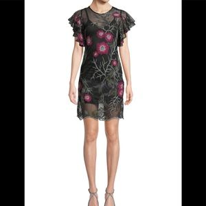 🌺 Free Generation ! Floral-Embroidered Mesh Mini Dress ! Crew neckline ! V Neck Illusion ! Short Ruffled Sleeves ! Sheath silhouette ! Scalloped Hem ! Pull over style ! Shell & sSlip Dress is 100% polyester ! Dry clean ! Black slip dress, black floral overlay ! From Neiman Marcus ! Love this brand ! Gorgeous ! 🌺