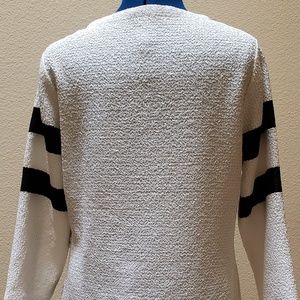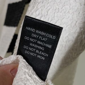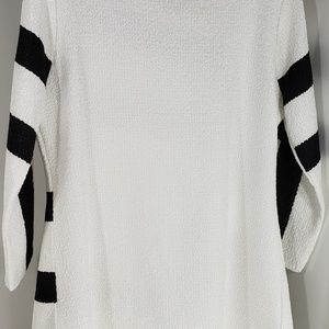 Black and white Geometric pattern with stretch to it. two snaps at the neck, a 3/4 sleeves and is NOT LINED. Light weight and super chic fashionable coat. great with jeans or dress up! Office to party!