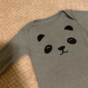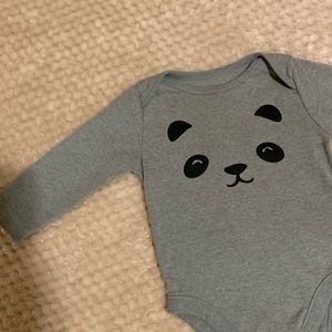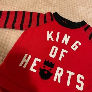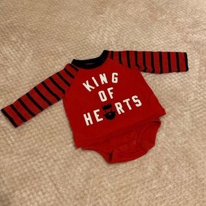 Baby gap long sleeve king of hearts onesie hidden underneath a long sleeve regular shirt look. Striped arms printed front with snap closure at neck and in back. Old navy long sleeve gray panda onesie, and official John Deere short sleeve camo onesie