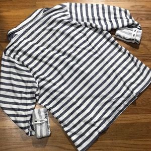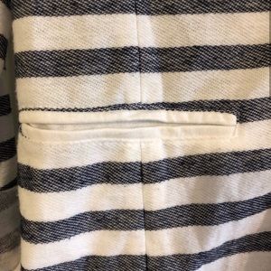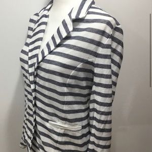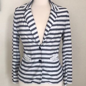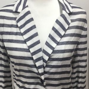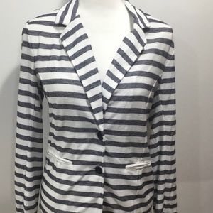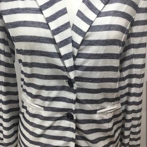 Preloved Gap striped light knit blazer. Long sleeves/ can be rolled up to 3/4 sleeves; 2 button closure; 2 front pockets; allover stripes; soft lightweight material; comfortable; versatile. Colors: blue and white. Material: 50% polyester, 38% cotton, 12% viscose. Measurements: approx 21” armpit to armpit, 18.5” across waist, 25” length, 25” sleeve length. Size L- true to size.