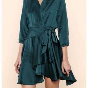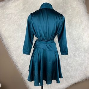 Teal Satin Latiste wrap dress.