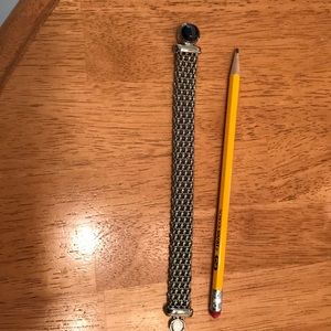 This elegant bracelet was a gift. While I find it extremely attractive, as my followers know, I only wear yellow gold. I am not sure what it is made of. Nor what the original cost. I’m assuming it was around $20, based on previous gifts received from this friend. The closure is a strong magnetic lock with what appears to be a semi- precious gem.
