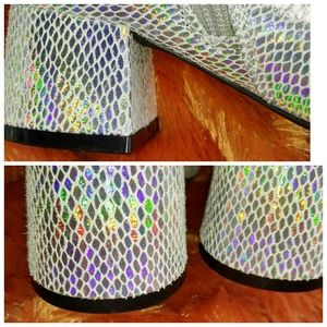 *These brand new ankle boots by Qupid are the cutest! They are a metallic silver, with an iridescent effect all over. They have a snakeskin pattern. They have a round-squarish toe, side zipper, and a low block heel. These fab boots would make any outfit fashionable with a touch of unicorn iridescence!*