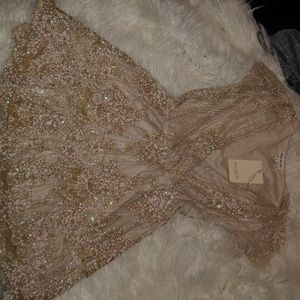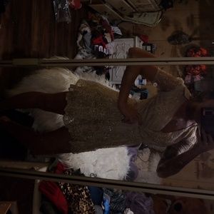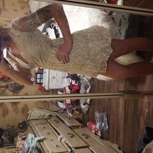 Beautiful flower sparkle detail gorgeous cream color with a v neck. This dress is to short for me I'm 5'4 and you can put a belt or a gold ribbon around to tie in a bow.