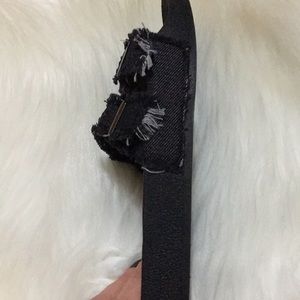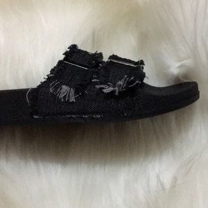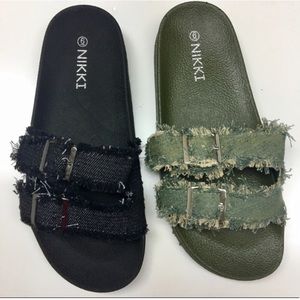 🌳 Nikki Fringed Top Denim Buckle Slides Black and Khaki Green