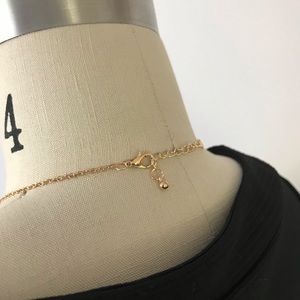 This gold tone mountain range necklace is dainty and whimsical. A series of snow capped mountains creates a bar with chain at each end. Adjustable length.